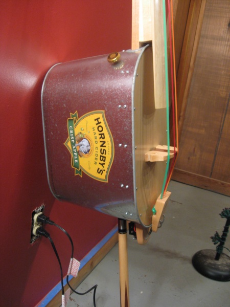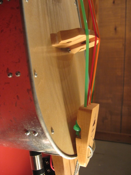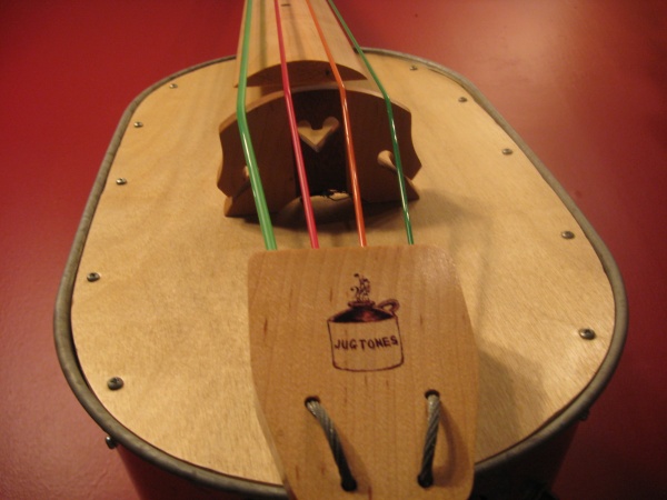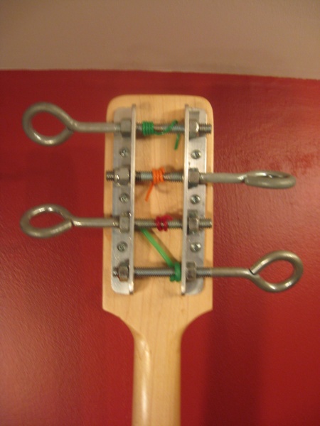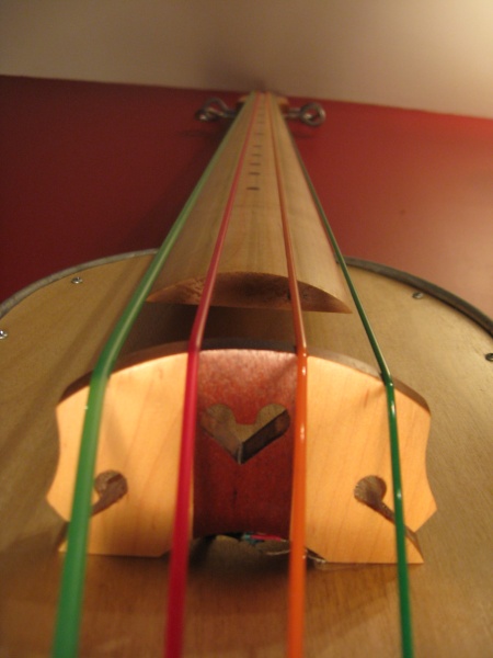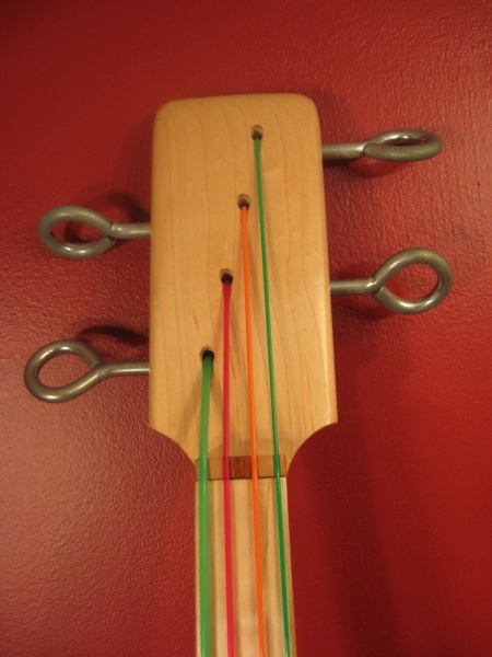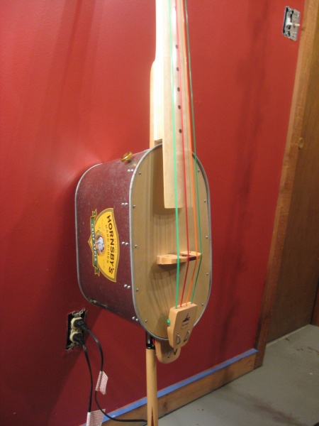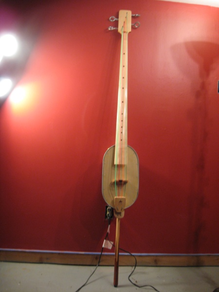 A full 40" scale upright bass made from a beer tub, eye-bolts, and several gauges of trimmer line. Big thanks go to Wichita Sam for hooking me up with pieces of his trimmer line stock. The internal pre-amp is my adapted version of Francis Deck's "Quick & Dirty Pre-amp" schematic. The pool cue was donated by Big Brother Bob, and, unlike bob, can be taken in half for easy travel.