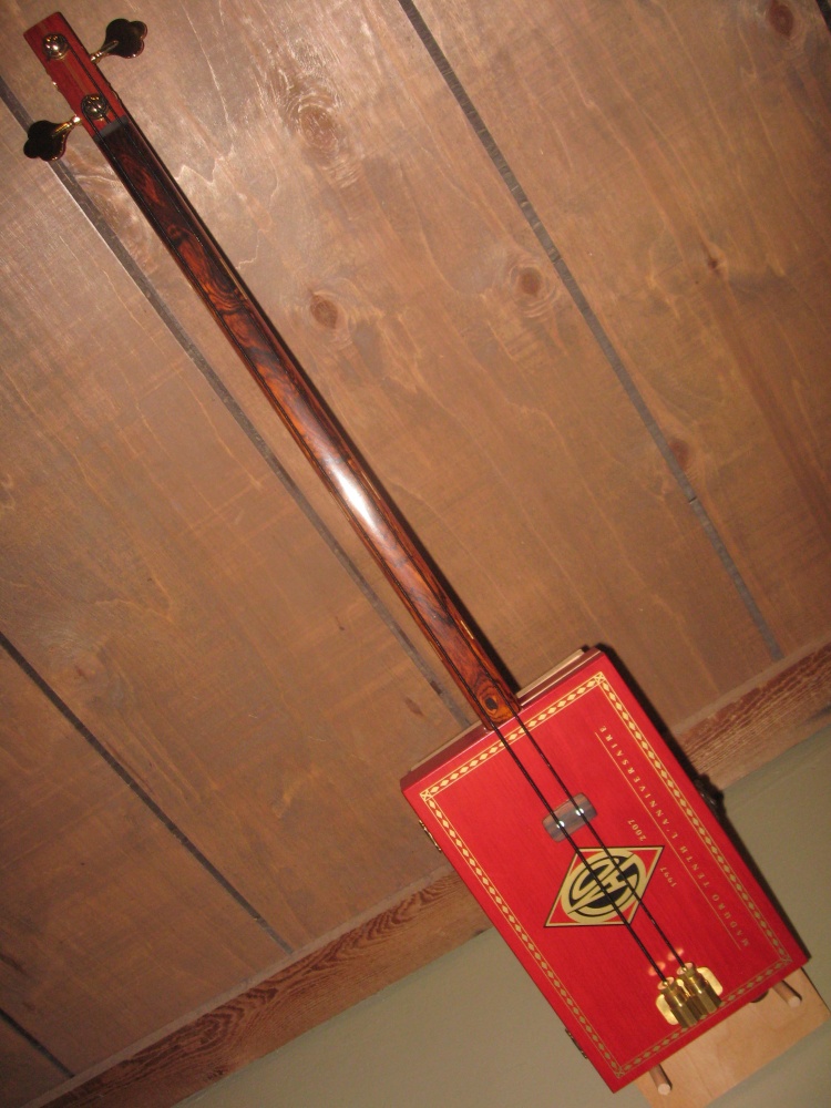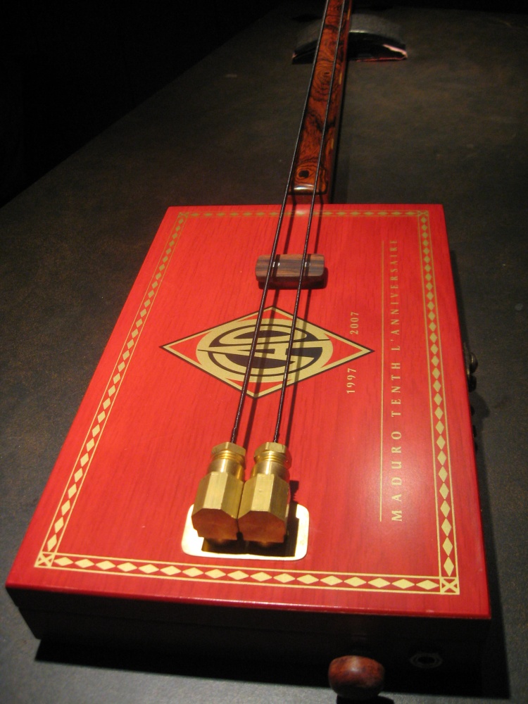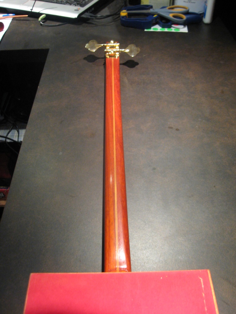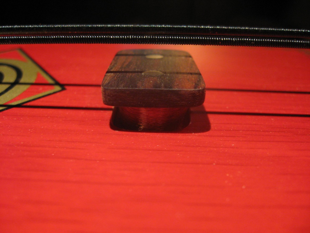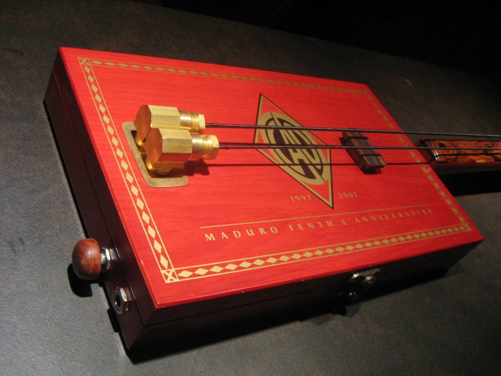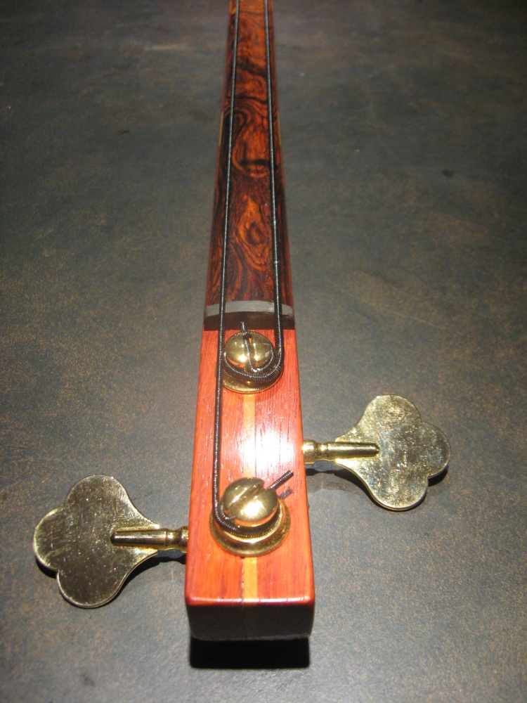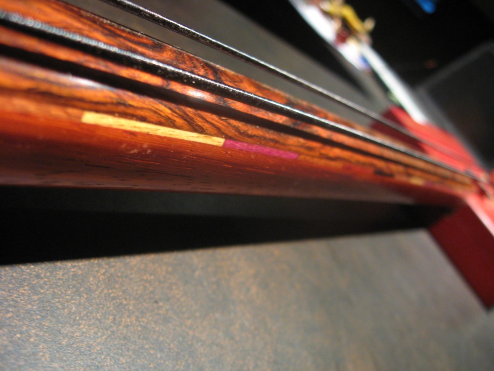 When i get my hands on a truly beautiful piece of timber I tend to save even the smallest scraps. Once in a while this comes in handy, but mostly it just takes up space. Just the same, i can't bring myself to discard or burn them. So.. for this cigar box guitar i've glued together scraps of Bloodwood, Ancient Kauri, Cocobolo, Ebony, Lacewood, Mahogany, Yellow Heart, Purple Heart, & Paduak. The intersection of each wood type indicates a fret location.