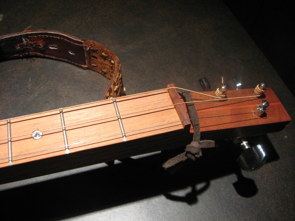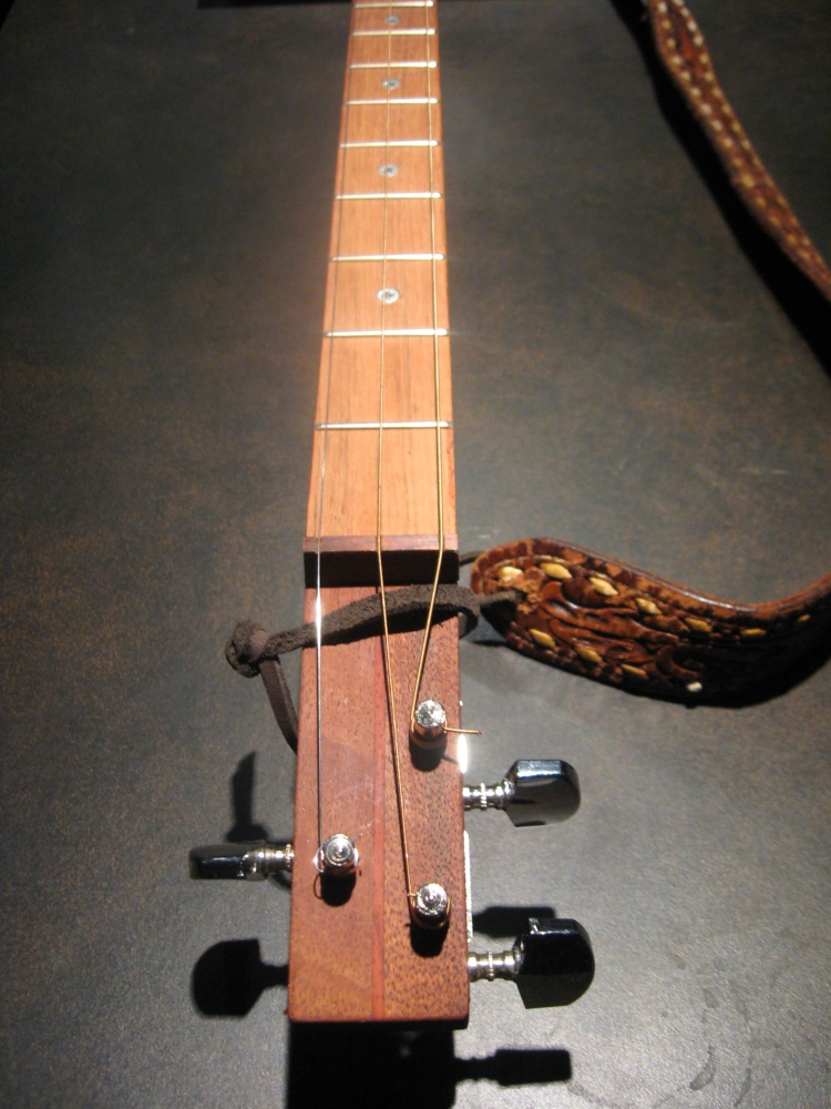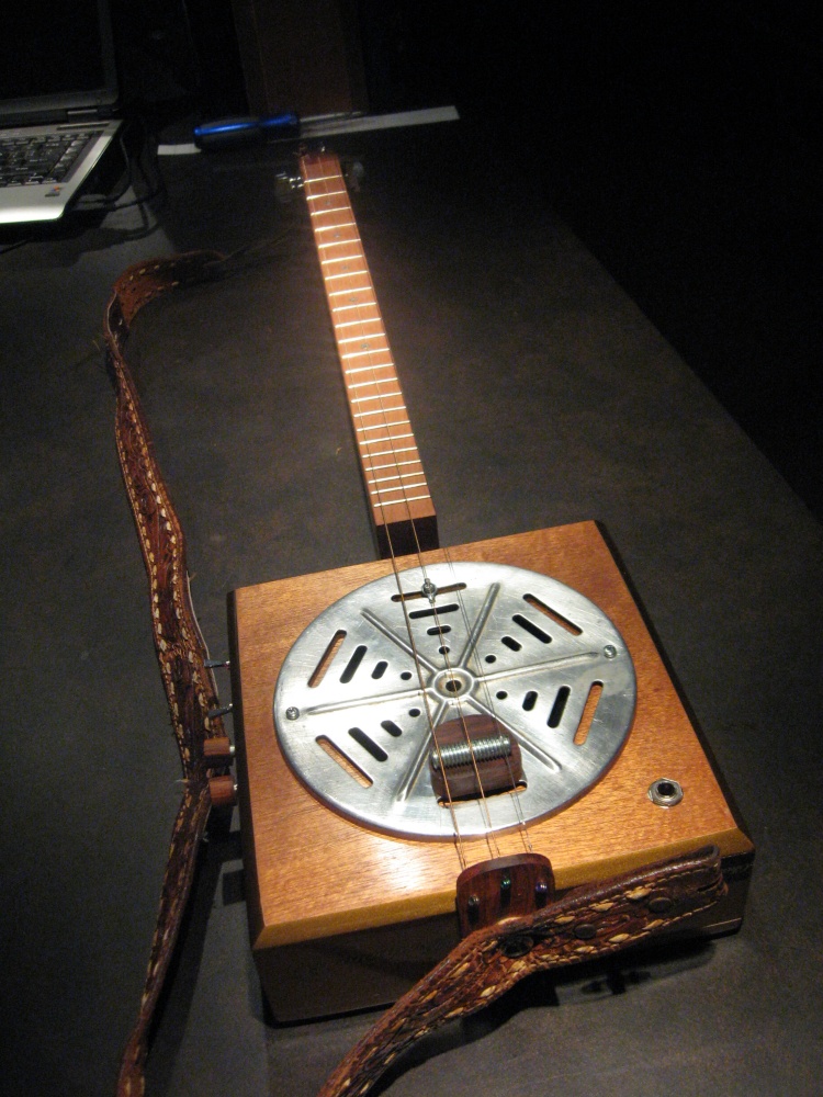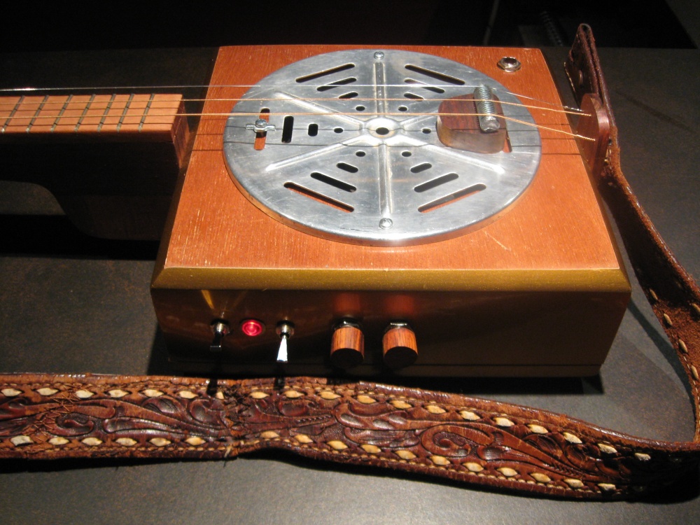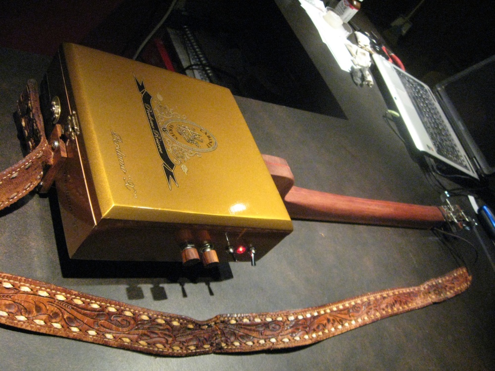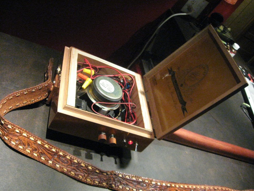 The Jamplifier is a cigar box guitar with an internal amplifier. It has an 1/8" input jack for your media player and a 1/4" output jack for playing through a larger amp. Use of the 1/4" jack automatically switches off the internal amp. The media input and piezo bridge pickup each have their own volume control so you can achieve a good mix when jamming over music or prerecorded accompaniment.