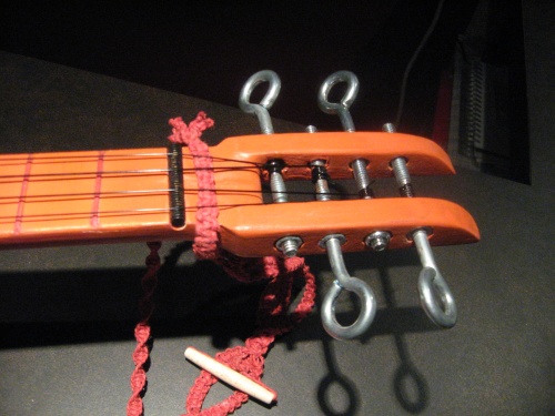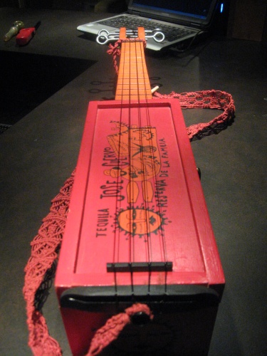 A good friend bought me this fancy bottle of tequila for Christmas. The tequila didn't last long, but the box has served me well over the years as both decoration, and as a container for things which may have otherwise had to sit out in plain view. It's been reborn as a ukulele, but its capacity for stuff holding has not been compromised, with the added bonus of a hemp macrame strap to help move it about.