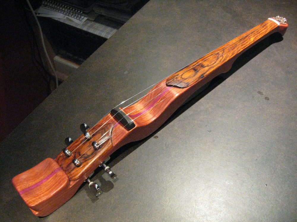 A stick & some strings. The strings are held at the headstock by crystal holders from a chandelier mounted on a train-flattened penny. The design accommodates both ball-end and loop-end type strings. It is amplified by a small piezo crystal embedded in the center of the bridge.